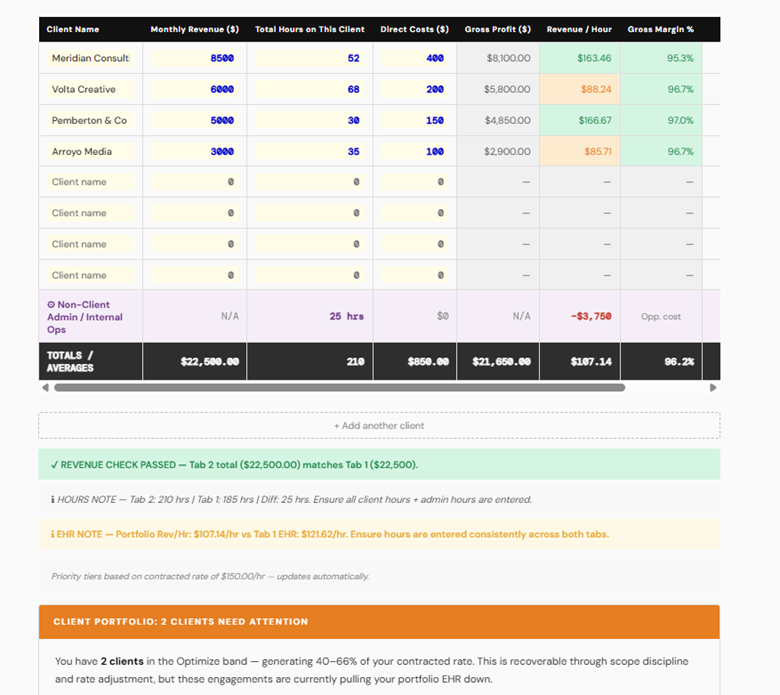 - ✓Client Margin Tracker — margin per client with priority tiers