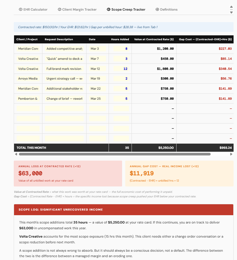 - ✓Scope Creep Tracker — logs individual scope events and calculates value lost