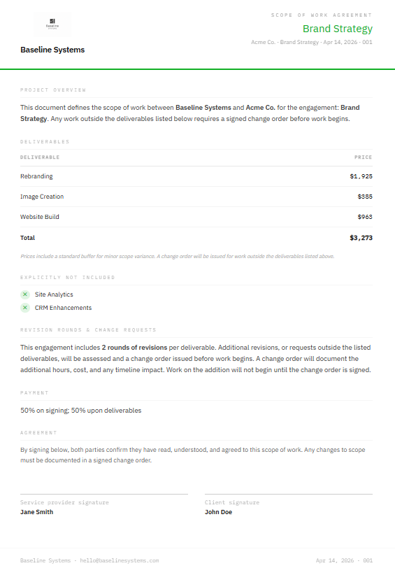 - ✓Scope Agreement Generator — deliverables, exclusions, revision rounds, payment terms, signature blocks