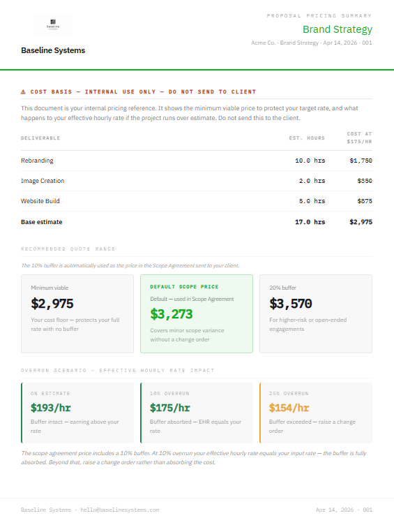 - ✓Proposal Pricing Summary (internal only) — cost basis, three quote options, overrun scenario table