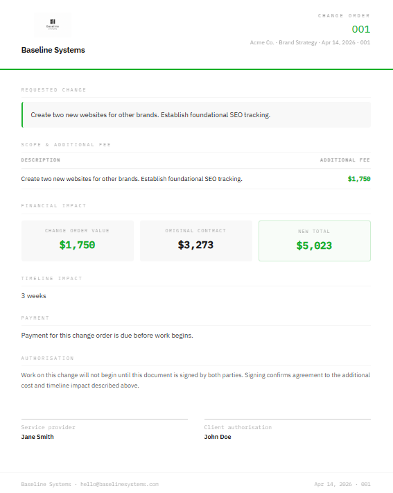 - ✓Change Order Generator — scope description, additional fee, new contract total, signature blocks